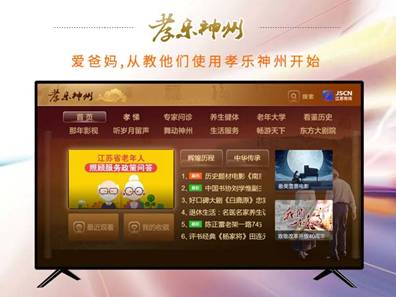 “孝樂神州”是江蘇有線為應(yīng)對人口老齡化問題,與國家老齡辦共同打造的國內(nèi)首個(gè)專門面向中老年觀眾的全服務(wù)平臺,整合最優(yōu)質(zhì)的內(nèi)容和服務(wù)資源近10萬小時(shí),設(shè)立健康、教育、文化、娛樂四大版塊,十三個(gè)欄目,通過線上線下融合的模式,全面、充分、貼心地滿足老年人群對身體健康,生活服務(wù),精神充實(shí),心情愉悅的核心需求。