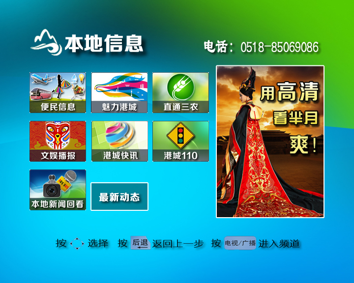 “數(shù)字電視本地信息平臺(tái)”是江蘇有線連云港分公司新近重點(diǎn)打造的服務(wù)民生、宣傳本地政務(wù)信息互動(dòng)平臺(tái)。在互動(dòng)電視中,“本地信息”與“數(shù)字電視”、“互動(dòng)電視”并列組成開機(jī)界面中的3大基本內(nèi)容。本地信息平臺(tái)帶有濃厚的本地特色,目前共設(shè)有便民信息、直通三農(nóng)、勞動(dòng)就業(yè)、文化港城、港城紅綠燈、電視商城、魅力港城、同步課件等8個(gè)版塊,每個(gè)版塊又根據(jù)內(nèi)容的不同分設(shè)不同的子欄目。