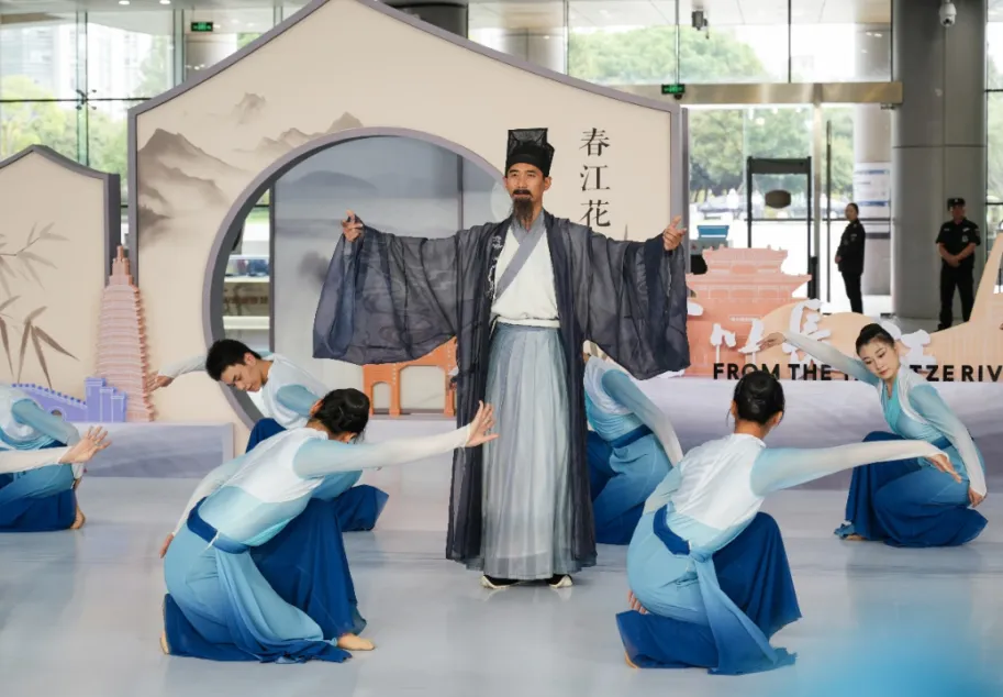 “大江東去,浪淘盡,千古風(fēng)流人物?!眴觾x式上,舞者們通過翩然的舞姿展現(xiàn)長江之磅礴氣勢與鱗波?!敖颖简v,文脈恒長”,隨著北宋文學(xué)家“蘇軾”形象的入場,嘉賓們跟隨著“蘇軾”的視角,一步入境,一同步入這場數(shù)字漂流,在流動的數(shù)字景觀中感知母親河的生命脈動,體悟“我與長江”的時代共振。